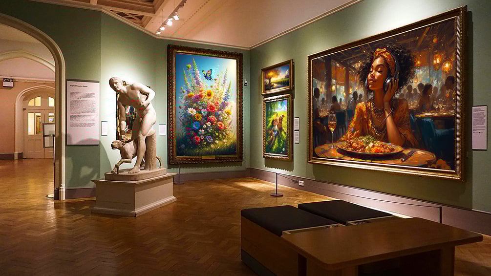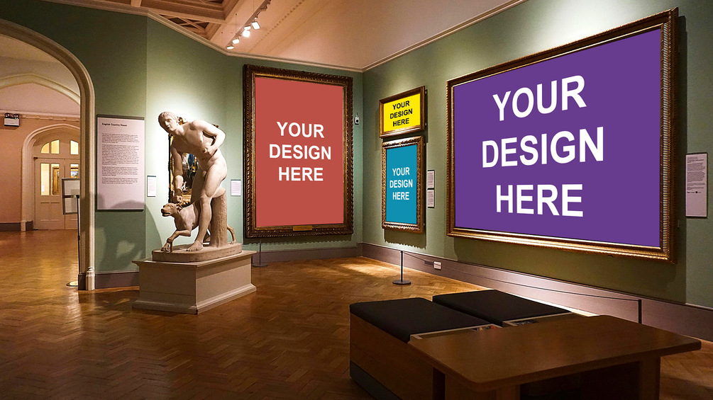 Presenting a mockup of a 4 differents painting frames in a museum. Place your own designs and admire the results, or share them with other.